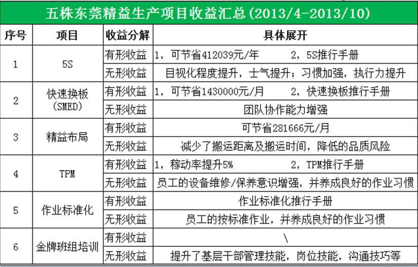 4、實(shí)施管理工具:包括5S與目視化管理、快速換板、精益布局(減少搬運(yùn)浪費(fèi))、TPM(設(shè)備保養(yǎng)、維護(hù)、稼動(dòng)率提升);