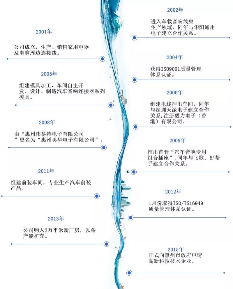 惠州奧華電子有限公司成立于2001年,公司占地面積10000平方米,建筑面積12000平方米,員工600余人。擁有一批優(yōu)秀的研發(fā)、技術(shù)、生產(chǎn)管理人才。專業(yè)開(kāi)發(fā)、生產(chǎn)、銷售汽車插座、線束、精密連接器等汽車部件。具有汽車連接器全程制造能力,包括精密模具、塑膠成型、五金沖壓、電線電纜、零部件及線束生產(chǎn)。公司產(chǎn)品已廣泛應(yīng)用于汽車音響、空調(diào)、防盜器、GPS導(dǎo)航、天窗、倒車?yán)走_(dá)、電動(dòng)門窗、儀表等汽車電子行業(yè),并與國(guó)內(nèi)外電子企業(yè)建立了良好的合作伙伴關(guān)系。