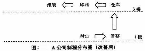 本制程為:1樓的射出完成后,由于后面的印刷效率遠遠大于輸出,所以射出后產(chǎn)品只能先入庫,經(jīng)過印刷后,要先在1樓暫存,等當班結束時再入3樓的倉庫,后一個制程-組裝需要時來3樓的倉庫領取。這個流程中有入存2次,WIP I次,勢必造成制造過早的浪費。