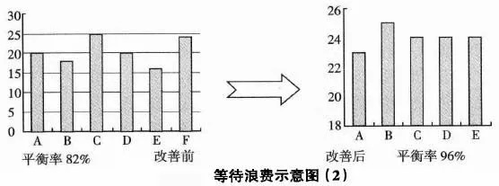 改善前有A-F共6個工站(制程),生產(chǎn)線不平衡,平衡率只有82%,等待較多。而改善后減少了一個工站,只有A一E共5個工站(制程),同時平衡率96%,減少了很多等待。