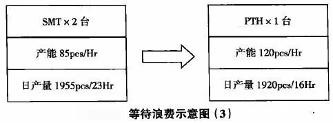 PTH日產(chǎn)量1920pce/16Hr,SMT日產(chǎn)量1360pce/16Hr,這樣安排的話,PTH制程上班的16個小時中有4.6個小時人和機處于等待狀態(tài)。