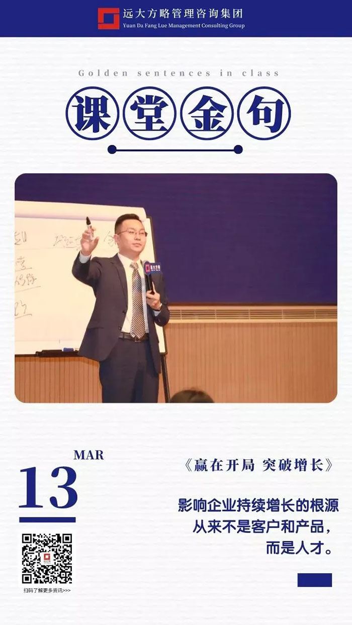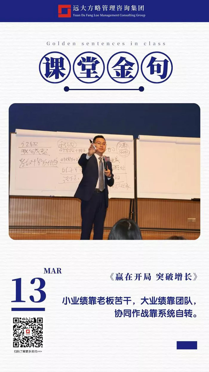 課上老師采用“道、法、術(shù)、器”相結(jié)合的形式給學(xué)員們帶來了一場(chǎng)精彩的知識(shí)盛宴。3月13日的課堂上兩位老師也總結(jié)了很多金句,可以很好的運(yùn)用到企業(yè)的經(jīng)營(yíng)管理中。為了幫助大家更好的吸收和鞏固兩天的學(xué)習(xí),小編整理了今天課程雷老師的部分金句分享給大家,希望能給大家?guī)砀鄦l(fā)。