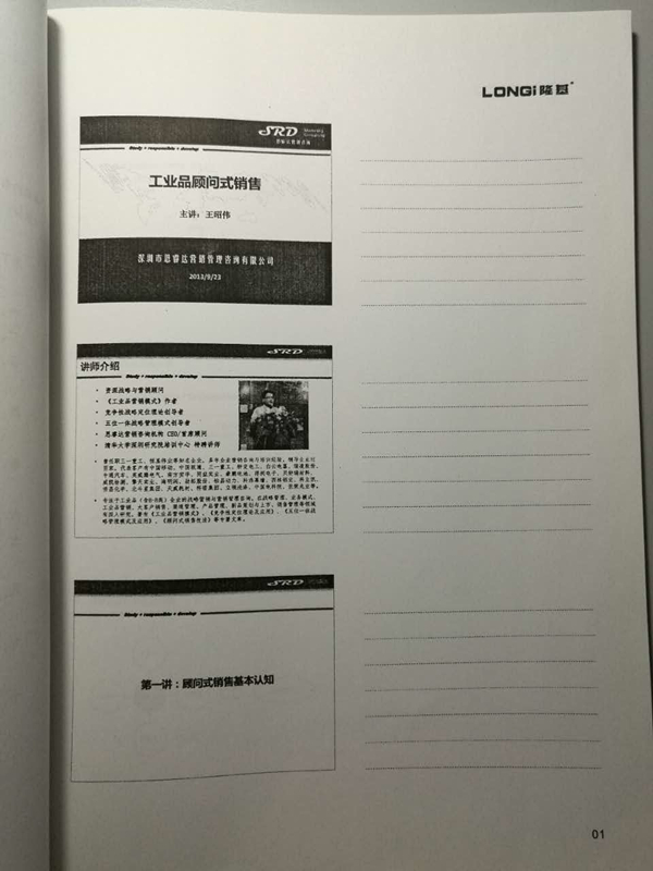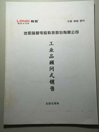 2013年10月7日,應(yīng)沈陽隆基電磁科技股份有限公司領(lǐng)導(dǎo)邀請,為隆基電磁培訓(xùn)《工業(yè)品顧問式銷售》,與隆基營銷團(tuán)隊(duì)100余人交流分享了工業(yè)品銷售相關(guān)技能。