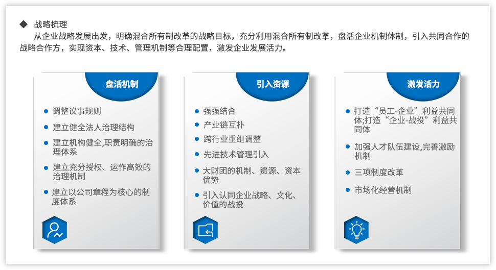 黨的十九大報(bào)告指出:“要深化國有企業(yè)改革,發(fā)展混合所有制經(jīng)濟(jì),培育具有全球競(jìng)爭(zhēng)力的世界一流企業(yè)”;當(dāng)前,隨著國企改革“雙百行動(dòng)”、區(qū)域性國資國企綜合改革試驗(yàn)、“科改示范行動(dòng)”、第三批以及第四批混改試點(diǎn)的實(shí)施,國企改革由點(diǎn)向面梯次鋪開、范圍逐步擴(kuò)大,并呈現(xiàn)明顯加速,國有企業(yè)改革進(jìn)入“深水區(qū)”。追本溯源,國企改革到底怎么改,回到國有企業(yè)改革的初衷我們認(rèn)為,國有企業(yè)改革是以混和所有制為手段,在堅(jiān)持黨的領(lǐng)導(dǎo)下建立現(xiàn)代企業(yè)制度,優(yōu)化管理關(guān)系,創(chuàng)新管理機(jī)制,激發(fā)員工活力,從而最終實(shí)現(xiàn)國有企業(yè)的持續(xù)發(fā)展?;旄穆鋵?shí)到具體實(shí)踐中,便處處是難點(diǎn)。遠(yuǎn)大方略認(rèn)為,混改的重點(diǎn)已經(jīng)從以“政策研究+方案制定”為主轉(zhuǎn)變到以化解落地過程中的實(shí)際痛點(diǎn)為主,從剖析“為什么混、和誰混、怎么混”轉(zhuǎn)變?yōu)槁鋵?shí)治理結(jié)構(gòu)、戰(zhàn)略協(xié)同以及激勵(lì)機(jī)制等深層次問題。