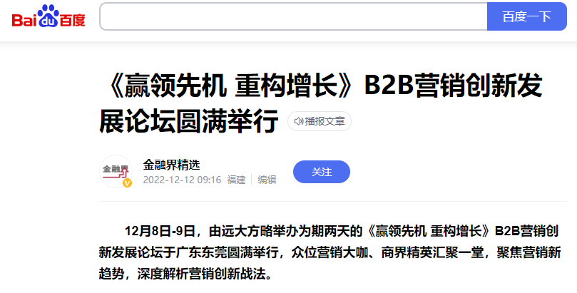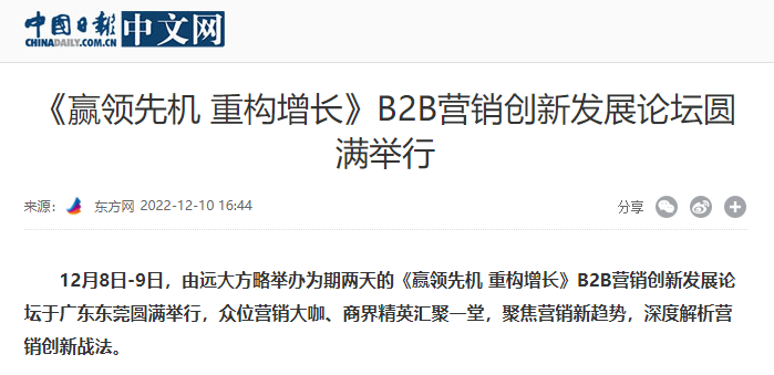 12月8日-9日,由遠(yuǎn)大方略舉辦為期兩天的《贏領(lǐng)先機(jī) 重構(gòu)增長》B2B營銷創(chuàng)新發(fā)展論壇于廣東東莞圓滿舉行,眾位營銷大咖、商界精英匯聚一堂,聚焦?fàn)I銷新趨勢,深度解析營銷創(chuàng)新戰(zhàn)法。
