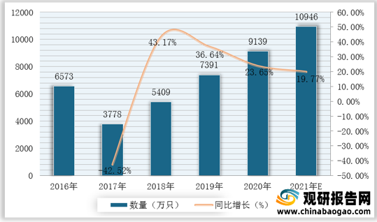 2016-2021年我國智能水表產(chǎn)量、增速及預(yù)測