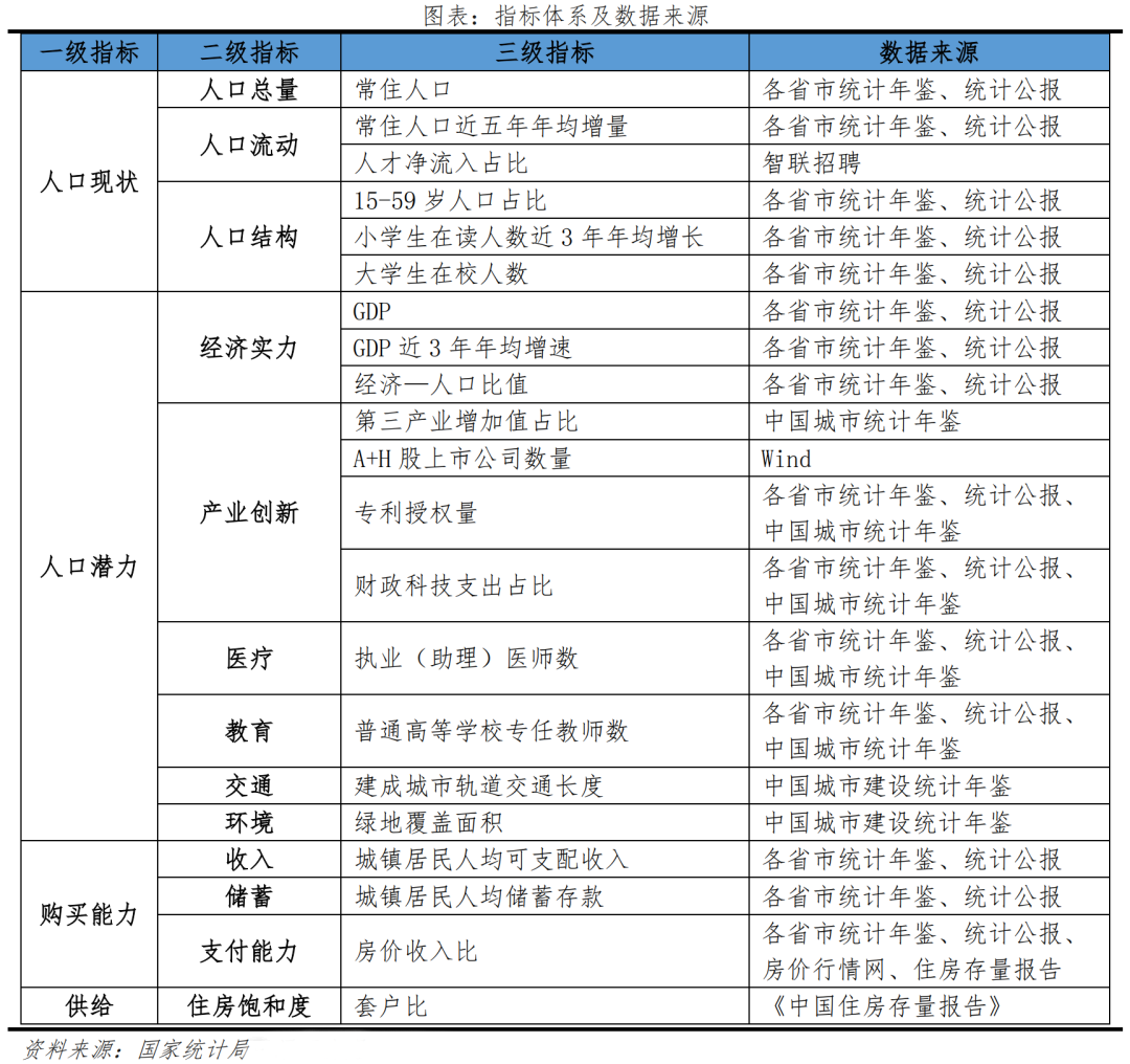在數(shù)據(jù)選擇上,我們從“需求+供給”兩個(gè)層面建立基本面分析框架。需求側(cè)關(guān)注人口現(xiàn)狀、人口潛力以及人口購(gòu)買(mǎi)能力,供給側(cè)關(guān)注區(qū)域住房存量情況,共涉及21個(gè)指標(biāo)。
