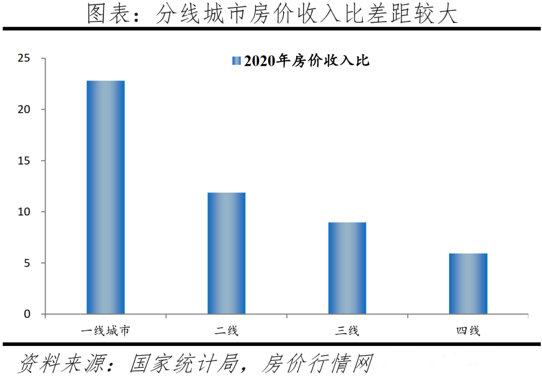 房?jī)r(jià)收入比方面,2020年一線(xiàn)、二線(xiàn)、三線(xiàn)、四線(xiàn)城市房?jī)r(jià)收入比分別為22.8、11.9、9.0、5.9,城市間分化顯著,這與全球其他經(jīng)濟(jì)體核心城市房?jī)r(jià)收入比較高的情況一致。