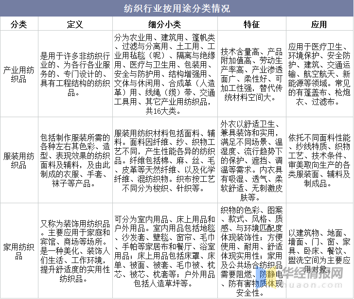 紡織行業(yè)按用途可分為產(chǎn)業(yè)用紡織品、服裝用紡織品和家用紡織品三大類,其中產(chǎn)業(yè)用紡織品指的是經(jīng)過專門設(shè)計、具有工程結(jié)構(gòu)特點的紡織品,通常具有柔性好、可加工性強、附加值高、產(chǎn)業(yè)滲透面廣等特點,主要應(yīng)用于醫(yī)療健康、日常清潔、環(huán)境保護、安全防護、建筑交通、航空航天等領(lǐng)域。按產(chǎn)品加工方式不同,產(chǎn)業(yè)用紡織品可分為非織造、針織、梭織、多層復(fù)合紡織等細分品類,其中非織造工藝生產(chǎn)產(chǎn)業(yè)用紡織品即為非織造布。
