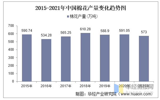 棉花是紡織行業(yè)最重要的原材料之一,目前國內(nèi)外棉花供給壓力均在高位,棉價或?qū)⒊掷m(xù)向上。據(jù)國家統(tǒng)計局數(shù)據(jù),2021年全國棉花產(chǎn)量達573萬噸,較2020年減少18萬噸。