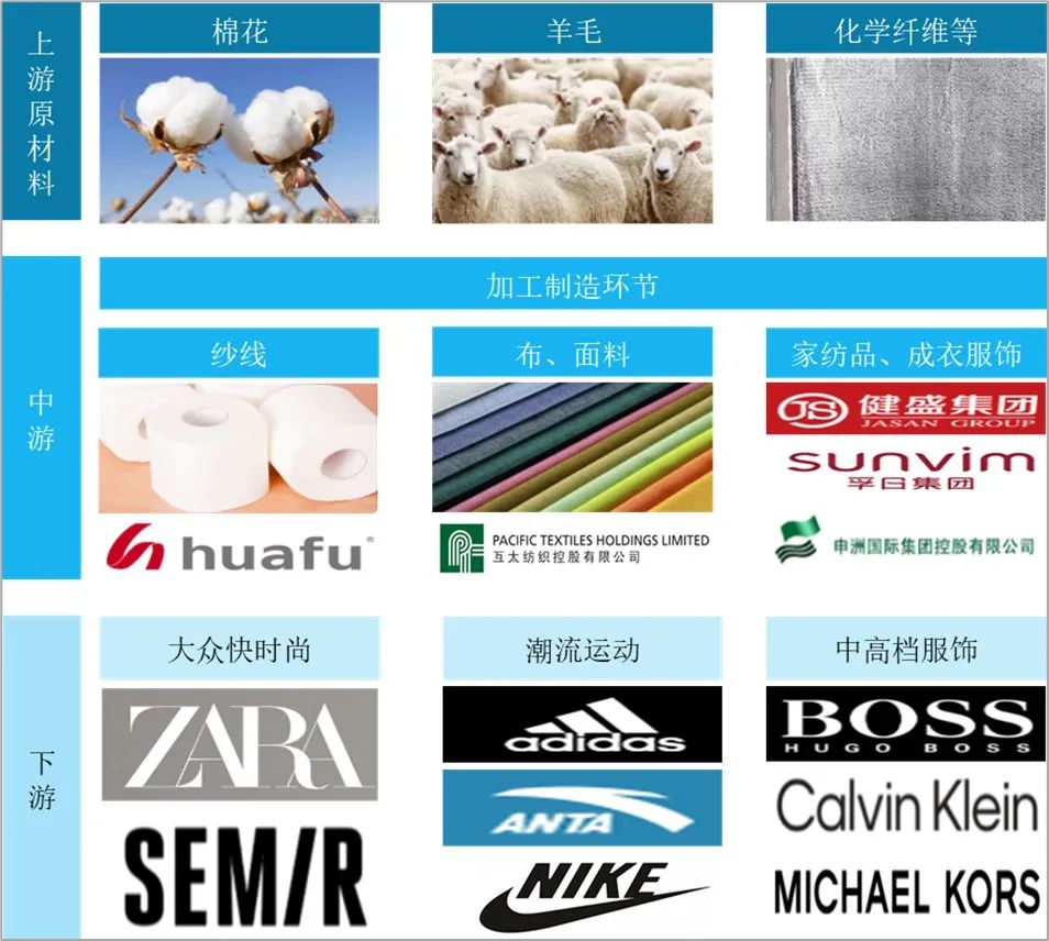 紡織業(yè)的上游原材料包括棉花、羊毛、化學(xué)纖維等,中游是紡織行業(yè)的加工及制造環(huán)節(jié),下游產(chǎn)業(yè)主要有服裝業(yè)、家用紡織品、產(chǎn)業(yè)用紡織品等。