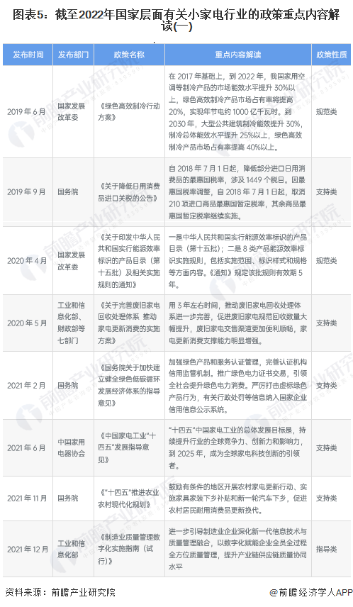 2022年1月,國家發(fā)改委擬定《關(guān)于做好近期促進(jìn)消費工作的通知》,鼓勵有條件的地方開展綠色智能家電下鄉(xiāng),通過企業(yè)讓利、降低首付比例等方式,促進(jìn)農(nóng)村居民消費。支持家電、家具等企業(yè)開展“以舊換新”、“以換代棄”活動,加強家電安全使用年限標(biāo)準(zhǔn)等宣傳解讀,鼓勵家電合理更新。2022年一季度,中國境內(nèi)零星爆發(fā)新型冠狀肺炎疫情導(dǎo)致經(jīng)濟(jì)增長受阻,國務(wù)院也于2022年5月制定了一攬子穩(wěn)住經(jīng)濟(jì)的政策措施,其中提及穩(wěn)定家電產(chǎn)品的消費??偨Y(jié)梳理來看,近年來國家層面對于小家電行業(yè)的政策關(guān)鍵詞在于:新一輪家電下鄉(xiāng)、以舊換新、補貼消費、家電回收。