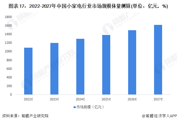 2021年,由于原材料價格上漲、宅經(jīng)濟(jì)減弱、上年市場規(guī)?;鶖?shù)較大等原因,中國小家電行業(yè)整體市場規(guī)模增速僅為0.99%,市場規(guī)模達(dá)到1017億元。展望未來,廚房小家電目前市場規(guī)模占據(jù)了小家電行業(yè)“半壁江山”,但行業(yè)、產(chǎn)品較為成熟,競爭格局穩(wěn)定,廚房小家電未來增速有所放緩;而家居小家電、個護(hù)小家電領(lǐng)域,在消費升級的刺激下,產(chǎn)品也不斷創(chuàng)新升級,推陳出新滿足當(dāng)下需求熱點,行業(yè)競爭較為充分,行業(yè)整體成長性良好,未來行業(yè)將保持中高增速。經(jīng)初步測算,2027年,中國小家電行業(yè)市場規(guī)模約為1611億元。