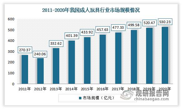 近年隨著我國經(jīng)濟(jì)的發(fā)展和居民生活水平的提高,居民開始注重精神層面的追求,玩具消費(fèi)的群體正在從兒童拓展到成年人,更多高檔、新穎的玩具逐漸成為成年人的消費(fèi)首選,促使成人玩具消費(fèi)規(guī)模迅速壯大。數(shù)據(jù)顯示,2020年我國成人玩具行業(yè)市場(chǎng)規(guī)模由2011年的270.37億元增長至530.23億元。