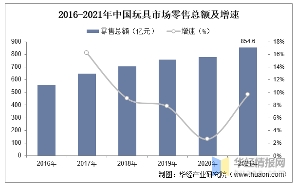 隨著我國(guó)玩具制造業(yè)持續(xù)發(fā)展,零售規(guī)模穩(wěn)定增長(zhǎng)。根據(jù)中國(guó)玩具和嬰童用品協(xié)會(huì)數(shù)據(jù),從2016年到2021年,我國(guó)玩具市場(chǎng)零售總額逐年增長(zhǎng),從556億元增長(zhǎng)至854.6億元,年復(fù)合增長(zhǎng)率為8.98%,行業(yè)發(fā)展態(tài)勢(shì)良好,市場(chǎng)空間不斷拓展。