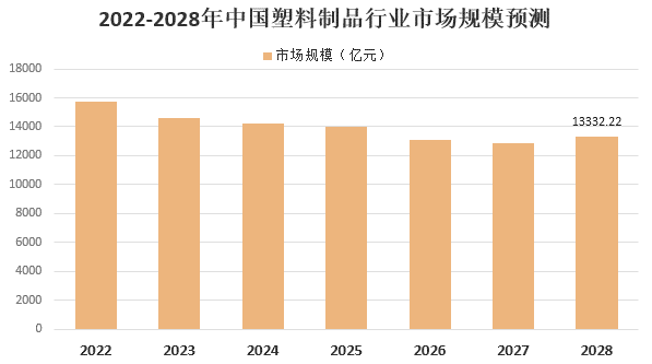 在政策限制下,傳統(tǒng)石化塑料制品行業(yè)將逐步收縮,預計2028年我國塑料制品市場規(guī)模下降至13332.22億元,行業(yè)未來幾年市場規(guī)模發(fā)展趨勢預測情況如下: