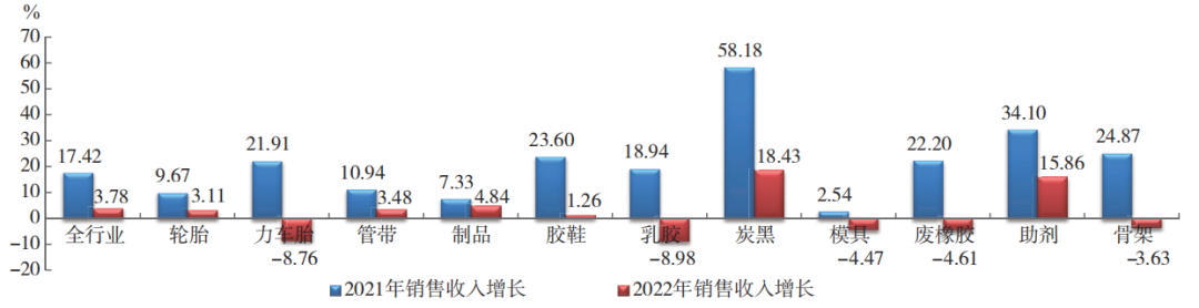 2022年,橡膠行業(yè)銷售收入增長3.78%,較上年度增幅減少13.64個百分點。