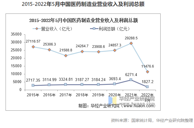 2016年,醫(yī)藥制造業(yè)由于受到一系列政策調(diào)控和企業(yè)轉(zhuǎn)型的影響,藥品價(jià)格受到嚴(yán)格監(jiān)管和控制,行業(yè)整體營業(yè)收入出現(xiàn)下滑,隨后市場競爭環(huán)境改善,營業(yè)收入逐漸恢復(fù)增長趨勢,2021年中國醫(yī)藥制造業(yè)的營業(yè)收入為29288.5億元,利潤總額為6271.4億元,利潤率為21.4%,截至2022年5月,我國醫(yī)藥制造業(yè)2022年利潤率為15.9%。