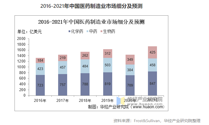 醫(yī)藥制造業(yè)三大種類中,化學(xué)藥的市場占比最多,化學(xué)藥主要用于人體疾病防治、診斷。應(yīng)用領(lǐng)域較為廣泛和普及,2020年我國化學(xué)藥市場規(guī)模大709億美元,占比49.2%;生物藥憑借其藥理活性高、特異性強(qiáng)、治療效果好等特點(diǎn),越來越受市場關(guān)注,其市場規(guī)模由2016年的184億美元增長至2020年的349億美元。慢性病的治療周期較長,我國中藥在慢性病的治療中具有不可替代的作用,2021年我國中藥制造企業(yè)規(guī)模預(yù)計(jì)為458億美元。