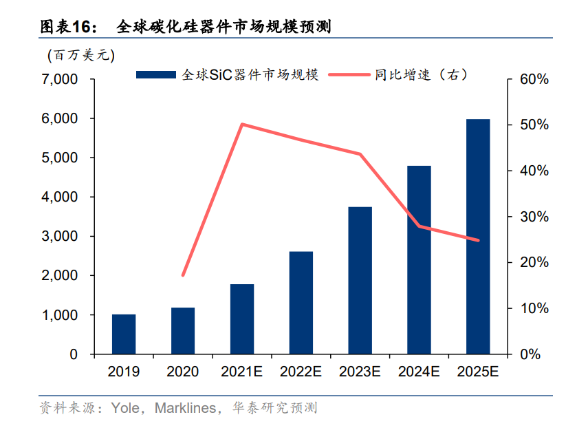 2020 年全球 SiC 器件市場規(guī)模達(dá) 11.84 億美元,預(yù)計(jì)到 2025 年有望增長至 59.79 億美元,對(duì)應(yīng)復(fù)合年均增長率為 38.2%。根據(jù)測算,在碳中和趨勢(shì)下,受益于 SiC 在新能源汽車、光 伏、風(fēng)電、工控等領(lǐng)域的持續(xù)滲透,SiC 功率器件市場規(guī)模有望從 2020 年的 2.92 億美元增長至 2025 年的 38.58 億美元,對(duì)應(yīng)復(fù)合年均增長率為 67.6%;以及在5G通信、下游SiC功率及射頻器件高速增長的需求也將帶動(dòng) SiC 材料市場規(guī)??焖俪砷L。