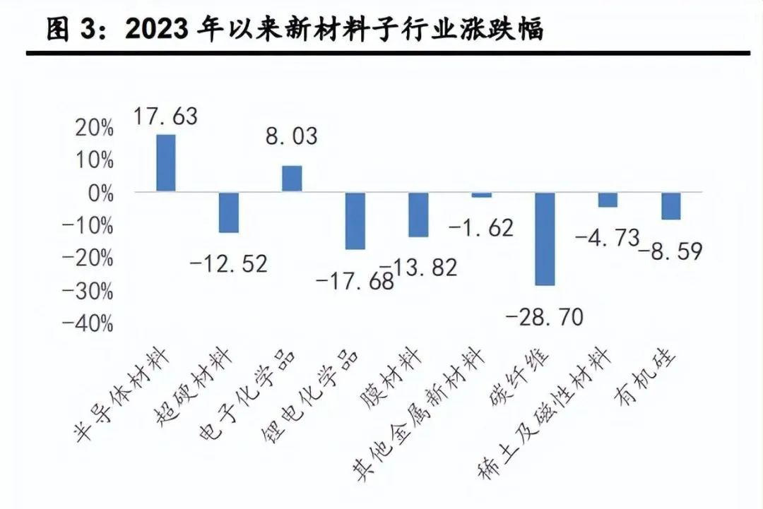根據(jù)工信部《新材料產(chǎn)業(yè)發(fā)展指南》,新材料主要包括先進(jìn)基礎(chǔ)材料、關(guān)鍵戰(zhàn)略材料、前沿新材料三大類。由于尚未有較為統(tǒng)一和明確的新材料子行業(yè)劃分標(biāo)準(zhǔn)。因此,我們根據(jù)《新材 料產(chǎn)業(yè)發(fā)展指南》,選取有機(jī)硅等行業(yè)代表先進(jìn)基礎(chǔ)材料板塊,選取半導(dǎo)體材料、 超硬材料、電子化學(xué)品、鋰電化學(xué)品、膜材料、碳纖維、稀土及磁性材料等行業(yè)代表關(guān)鍵戰(zhàn)略材料;選取公司主營(yíng)業(yè)務(wù)以金屬增材制造材料為主的其他金屬新材料行業(yè)代表前沿新材料,共同組成新材料子板塊。