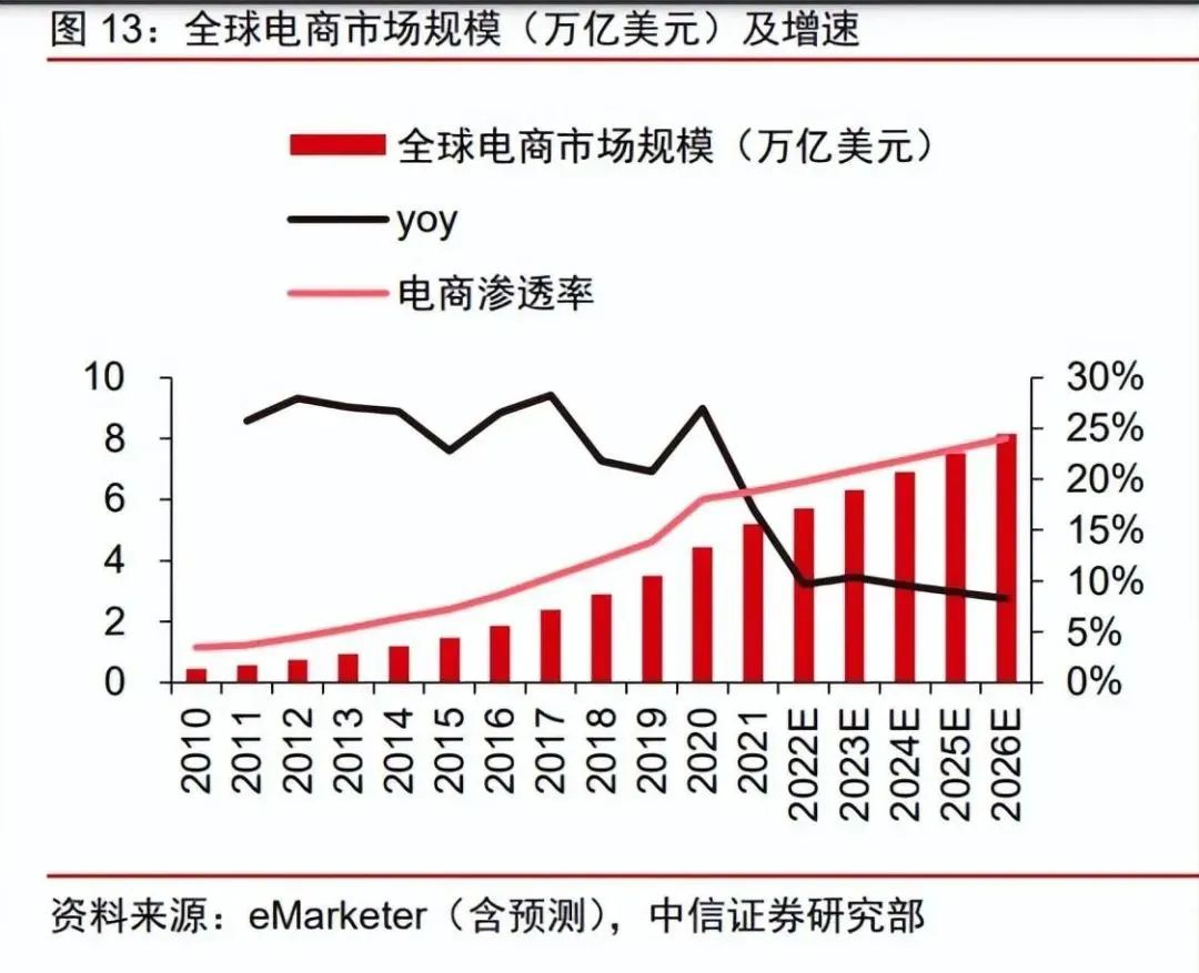 疫后消費(fèi)線上化趨勢(shì)延續(xù),2026 年全球電商滲透率有望達(dá) 24%。疫情加速培育全球用戶電商消費(fèi)習(xí)慣,根據(jù) eMarketer,全球電商市場(chǎng)規(guī)模 2019-2021 年 CAGR 為 22%。盡管全球疫情已進(jìn)入常態(tài)化防控階段,但消費(fèi)者線上購(gòu)物的習(xí)慣仍然得以保持,根據(jù)相關(guān)數(shù)據(jù)顯示,疫情后依然會(huì)偏好線上購(gòu)物的用戶數(shù)在不同品類提升 5%-15%。消費(fèi)線上化趨勢(shì)下,根據(jù) eMarketer,預(yù)計(jì) 2026 年全球電商市場(chǎng)規(guī)模有望達(dá) 8.1 萬億美元,2022-2026 年 CAGR 為 9%,2026 年全球電商滲透率有望達(dá) 24%。