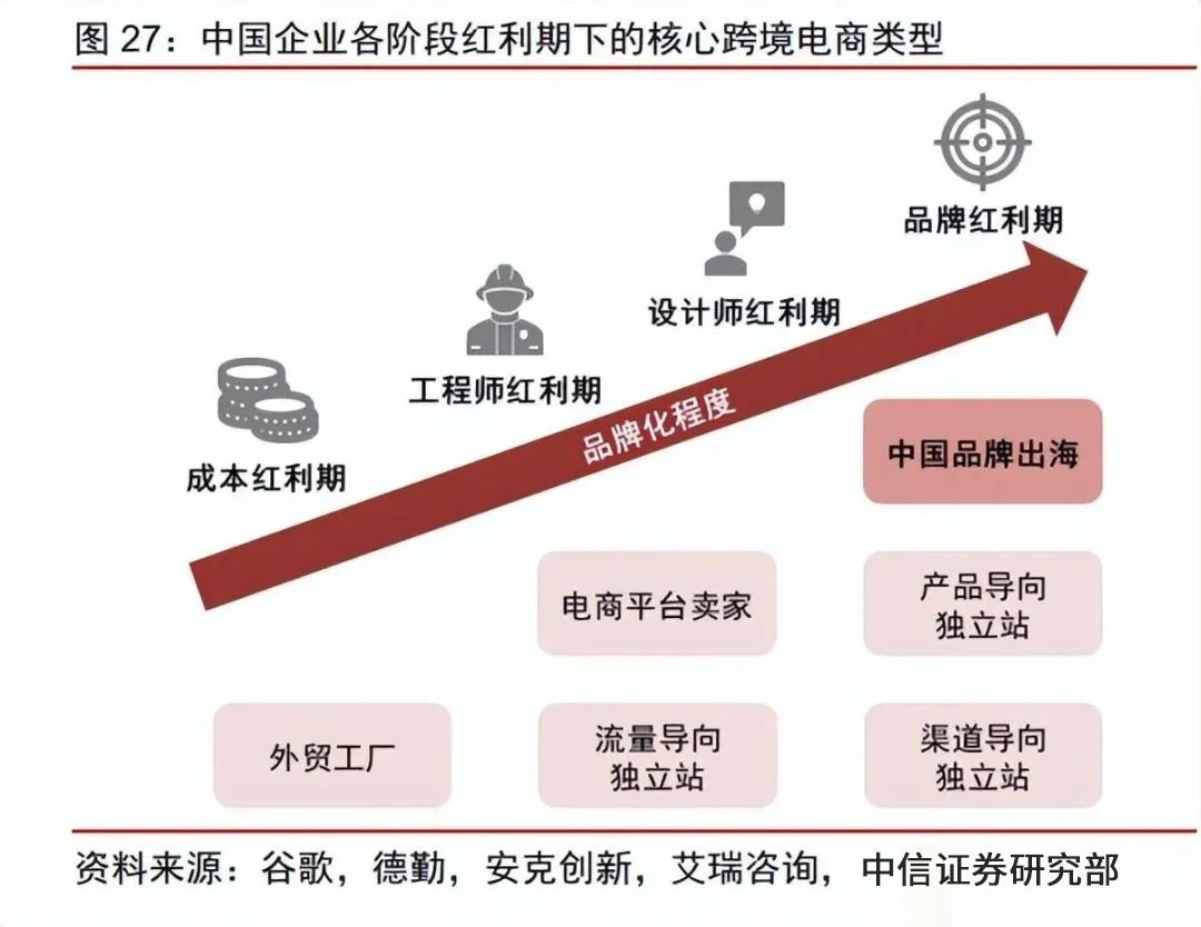 早期,憑借國(guó)內(nèi)的勞動(dòng)力優(yōu)勢(shì),中國(guó)制造的高性價(jià)比產(chǎn)品快速打開海外市場(chǎng),但也帶 來了消費(fèi)者價(jià)格敏感、用戶粘性及心智較差等問題。經(jīng)過二十余年發(fā)展,隨著我國(guó)跨境電商模式的逐漸成熟、產(chǎn)業(yè)鏈布局的逐漸深入,以及行業(yè)競(jìng)爭(zhēng)的日益激烈,國(guó)內(nèi)跨境電商賣家正在實(shí)現(xiàn)從中國(guó)制造到中國(guó)品牌的升級(jí),以提升消費(fèi)者心智并強(qiáng)化議價(jià)能力。