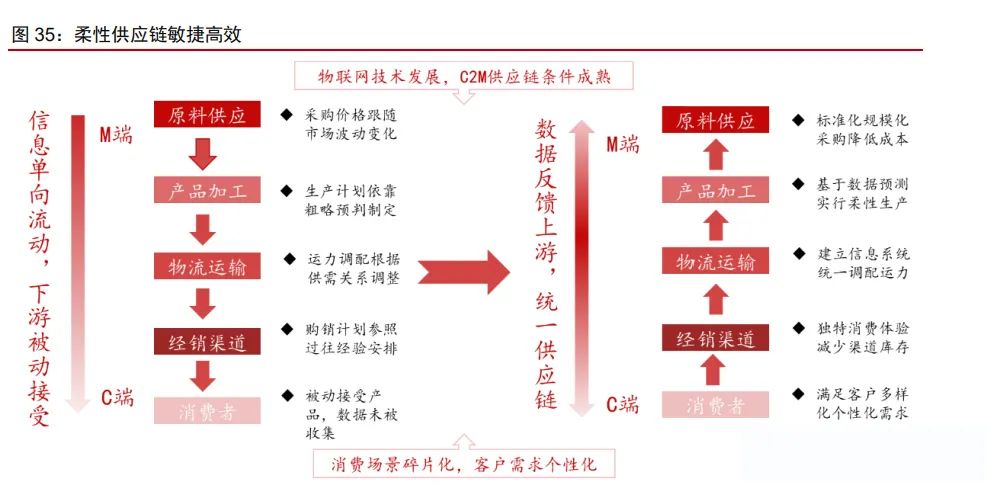 柔性供應(yīng)鏈高度敏捷,更快捕捉趨勢(shì)性機(jī)會(huì)。中國(guó)供應(yīng)鏈高度靈活敏捷,對(duì)傳統(tǒng)供應(yīng) 鏈的數(shù)字化賦能、消費(fèi)者數(shù)據(jù)的沉淀以及逆向反饋使得工廠具有按需生產(chǎn)的能力,大幅降 低商家?guī)齑婧统杀緣毫Γ?ldquo;小單快反”的模式也能幫助商家更快地捕捉趨勢(shì)性機(jī)會(huì)。以柔性供應(yīng)鏈的極致踐行者 Shein 為例,根據(jù) Zara 財(cái)報(bào)及晚點(diǎn) LatePost,Shein 從收到訂單 到產(chǎn)品出廠/庫(kù)存周轉(zhuǎn)天數(shù)只需 5/30 天,生產(chǎn)及周轉(zhuǎn)效率明顯高于 Zara、H&M,而生產(chǎn)成 本僅為 Zara 的 30%-50%。