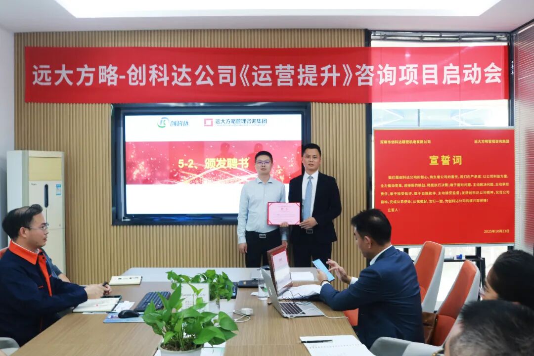 近日,深圳市創(chuàng)科達精密機電有限公司(以下簡稱“創(chuàng)科達”)攜手遠大方略啟動《卓越運營》咨詢項目,進行科學、系統(tǒng)的管理升級,優(yōu)化供應鏈管理,減少庫存積壓,提升資金周轉率;現(xiàn)場 5S 管理營造干凈整潔的環(huán)境,提高效率與質量,降低事故率;完善組織架構,提升團隊管理效率,合理配置資源,提高決策準確性。全方位提升運營管理水平,為企業(yè)高質量發(fā)展注入強勁動力。