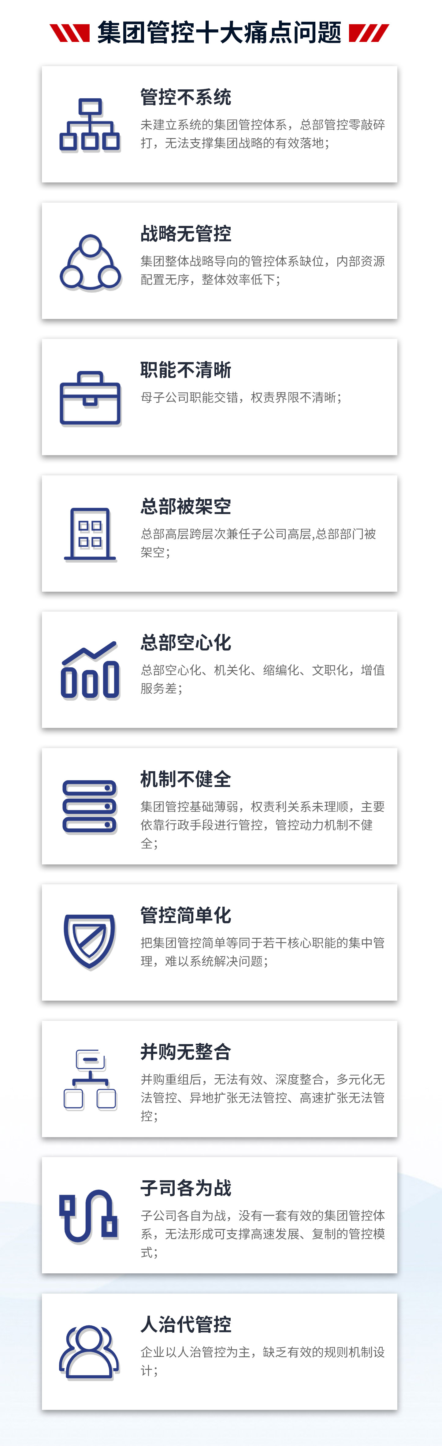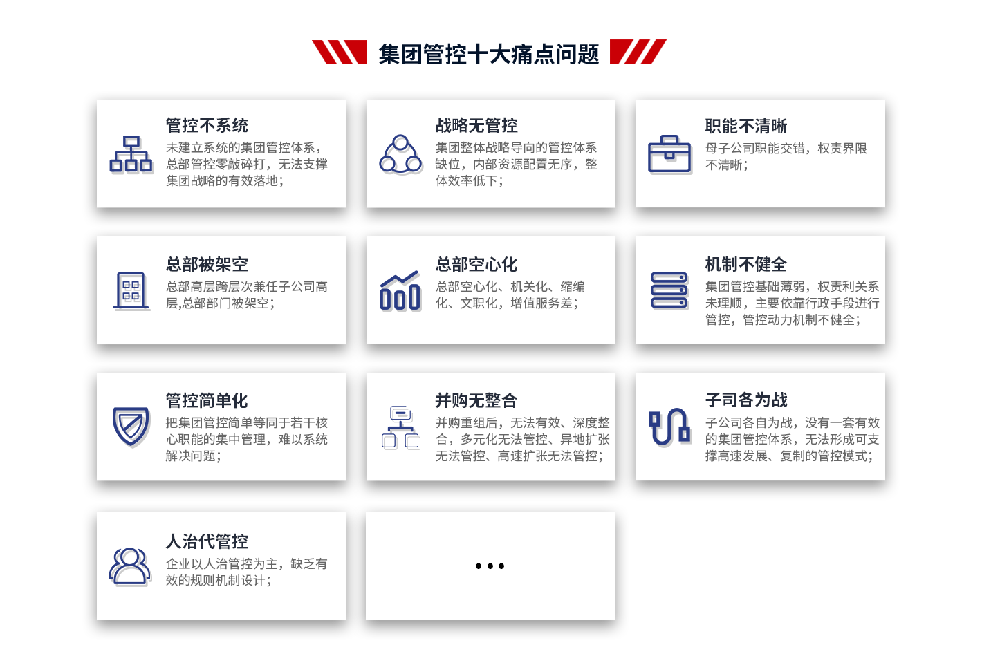 4、數(shù)據(jù)增長(zhǎng):支撐集團(tuán)戰(zhàn)略落地;解決集團(tuán)因跨層次、多法人帶來(lái)的管控難題;減少因跨層次管理帶來(lái)的損耗,提高集團(tuán)內(nèi)部資源配置效率;理順管控價(jià)值基礎(chǔ),實(shí)現(xiàn)集團(tuán)整體價(jià)值的最大化;打造強(qiáng)勢(shì)總部,解決集團(tuán)總部空心化、文職化等問(wèn)題。